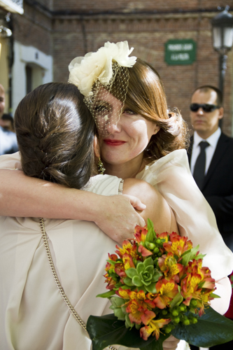 Merce & Óscar or the creativity and the numbers. They came to us with a beautiful story that we transformed into a wedding invitation and then they asked for the shooting. We were with Merce since the sun was up while she was dressing up in an apartment in the heart of Malasaña. The dress was made with an Indian fabric and the bouquet was colorful just like her personality. Everything in their wedding was meant. She met Óscar in an old blue Seat 600 which waited for then during the celebration in Chamberí (Madrid). The party continued in the Filandón restaurant in the best company.